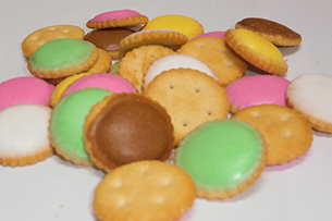 ビスケットやクッキーの生地に印刷して商品化するだけでは面白味が無い…そんな時は是非ヨーチ加工を当社のヨーチ加工をご利用ください!白・ピンク・水色・黄色…お客様ご指定の色でお菓子の上にヨーチ加工いたします。価格もアイシングより安価に加工が可能です。
