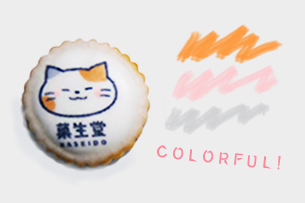 ビスケットやクッキーの生地はクリーム色だったり茶色だったり…どんなに印刷がきれいでも生地の上に印刷する限り、色は褪せてしまいます。ヨーチで加工すればプリントするイラスト・ロゴ・文字に合わせてお客様のご希望に合わせて色を再現いたします。